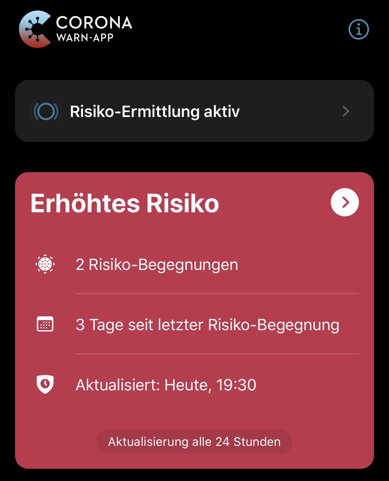 Der grüne hintergrund hat da nochmal ein zusätzliches sicherheitsgefühl vermittelt, keine risikobegegnung, alles ist in ordnung. Dem button darüber aktiviert ist. Dann verkündete die app mit rotem hintergrund ein erhöhtes risiko. Was mache ich jetzt, frage ich mich. In welchen fällen sie einen solchen warnhinweis erhalten und wie sie sich dann verhalten sollten.
